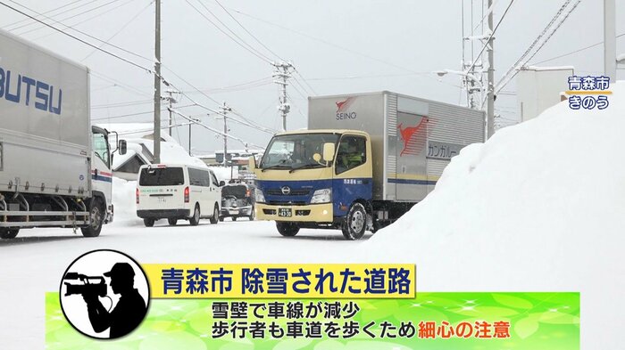 本来、右折車線と直線車線あるんですけど、雪で通れないので(車道が)減っちゃっているんで。両側に除雪しちゃっているから歩道もないんで、(歩行者が)車道を歩いていたりして。