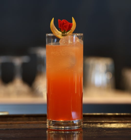 ゴルフのラウンドを終え、ホテルから眺める夕暮れのフェアウェイをイメージ。沈みゆく太陽の赤はカンパリの苦味。一日の高揚と余韻を包むピーチツリーの甘さ。、そしてグレープフルーツの爽やかな酸味は、心地よい疲労と明日の一打への期待を表しています。