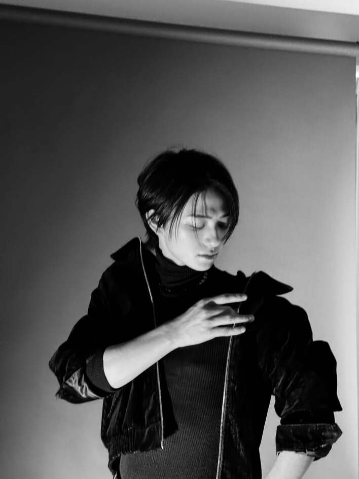 公開された写真では、まず黒いジャケットを着用したモノクロのショットが目を引きます。右手を胸の前に伸ばし、視線を下に落とした沈んだ雰囲気で、強い明暗と陰影が印象的です。