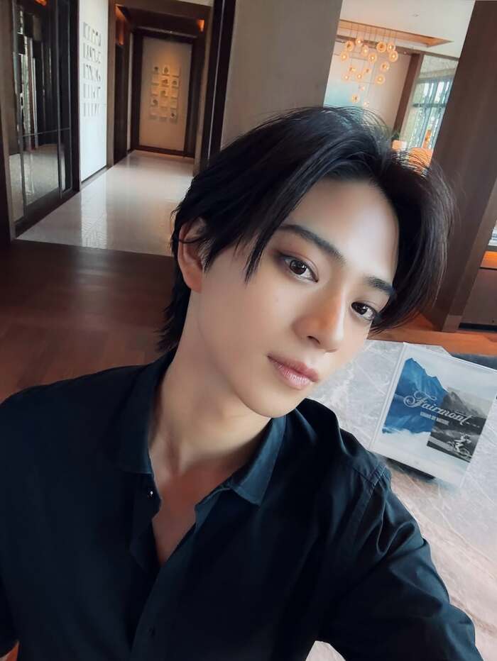 別のショットでは、モダンな内装の室内で黒色のシャツを着て自撮りをする姿が。カメラに視線を向け、穏やかな微笑みを浮かべています。
