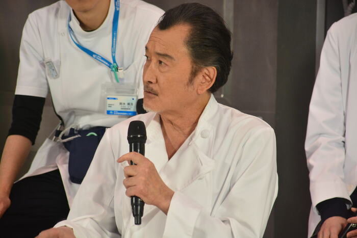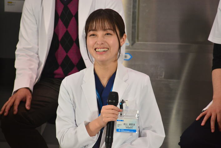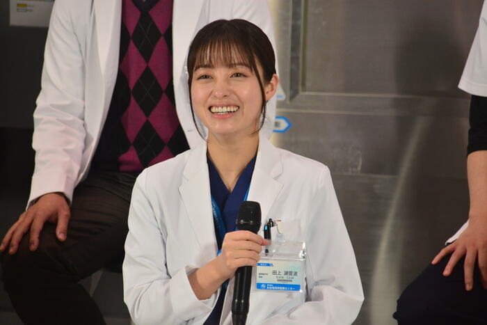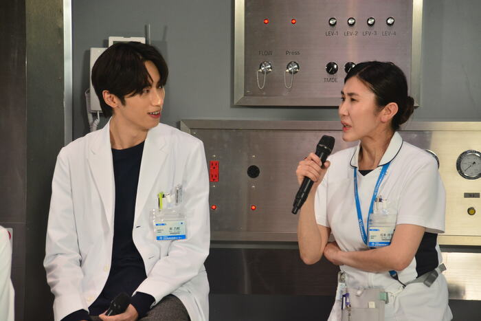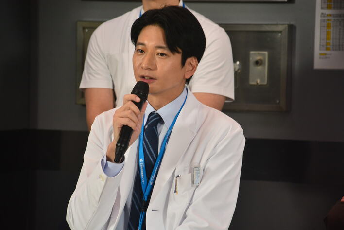 ドラマの撮影で実際に使われているセットに登場したキャスト陣。ひとこと挨拶を求められると、お互いに「よっ!」などと掛け声をかけあって盛り上げるチームワークの良さを見せます。