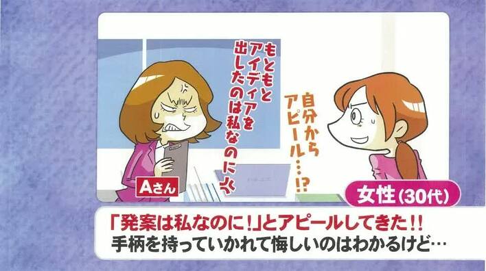 まず、話題になったのは職場での悔しさアピールについてだ。「Aさんの企画から生まれた商品が大ヒットしたのだが、商品化したBさんだけが評価されている」場合、Aさんが「自分の手柄だ!」とアピールするのはアリなのか。