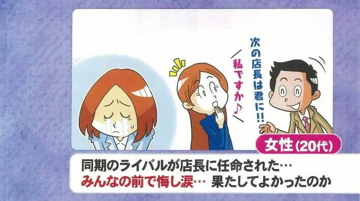 また、「周囲から有力視されていた店長のポストに、ライバルの同期が任命され、会議の場で悔し涙を流してしまった」という20代女性のエピソードについては、「“だから女は…”と言われてしまうから、職場では絶対に悔し涙はダメ!」「悔し涙だけは笑い話で流せないから、我慢して」と、リンゴと横澤がエールを送った。