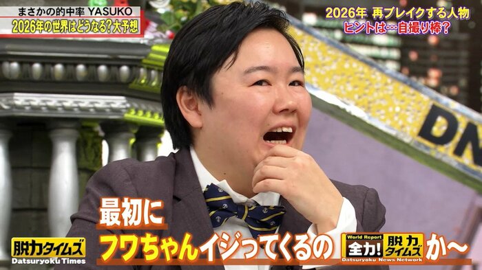 「最初にフワちゃんでイジってくるの、『脱力タイムズ』かぁ」「ここで出したくなかったなぁ。もう解決してるんですよぉー」と、自ら自身とフワちゃんとの騒動に触れて苦笑い。