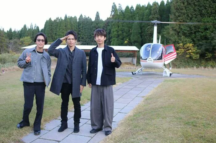 お次は、ヘリコプターに乗って阿蘇山を空から楽しむことに。離陸前から余裕の表情の亀梨さんに対し、「浮いた浮いた!こっわ!」、「どうなってんの、これ?」と緊張気味の上田さんと中丸さん。阿蘇山の雄大な景色が見えてくると、3人のテンションはますます高まっていきます。