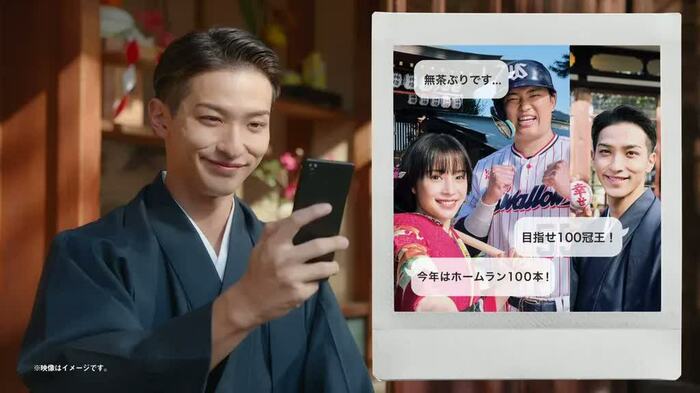CMでは、バットを手に、ユニフォーム姿で境内に降臨した村上選手は、広瀬さんが「今年も日本中に幸せホームラン…届けてください」という願いを込めて放った“幸せボール”を、豪快なスイングで打ち返します。すると、無数に分かれたボールが上空の雲を突き抜けて、あちこちに飛んでいき、そのうちの1つを別の場所で餅つきをしていた横浜さんが、見事にキャッチします。