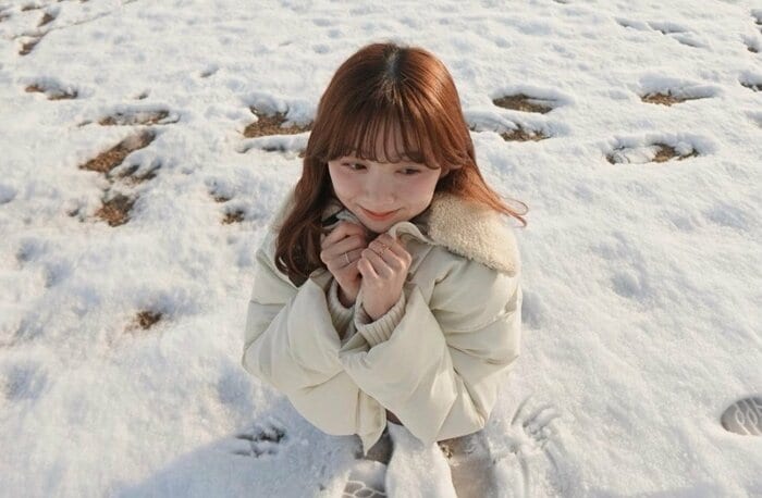 うっすらと積もった雪の中で、白いダウンコートに身を包みながらたたずんでいます。
