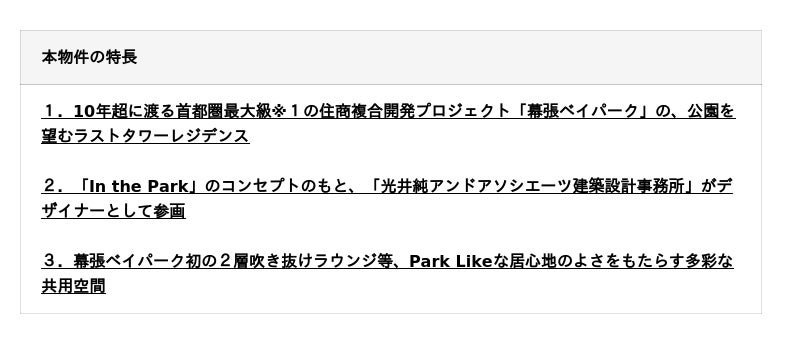 「幕張ベイパーク」内には大型のスーパーマーケットやコンビニエンスストア、雑貨店等の買い物施設、複数の飲食施設、 保育所・学童等の教育施設、アリーナ付きのフィットネス施設やサッカー・フットサル・テニス等ができるスポーツ施設、クリニックが入居するメディカルモール、自由な働き方を提供するコワーキング施設等が揃っており、日常生活を便利で快適に過ごせるようミクストユースの開発に取り組んでおります。