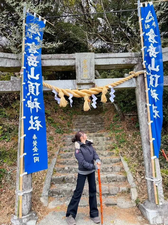 手には赤い杖を持ち、境内へと続く長い階段を見上げるその視線には、まるでこれからの参拝に向けた気合が込められているようです…!