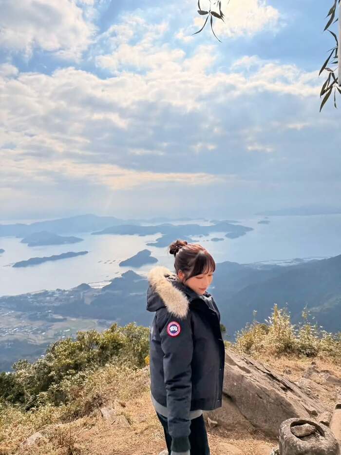 頂上についたのか、眼下に海と島々が広がる絶景ポイントで撮影した写真も。