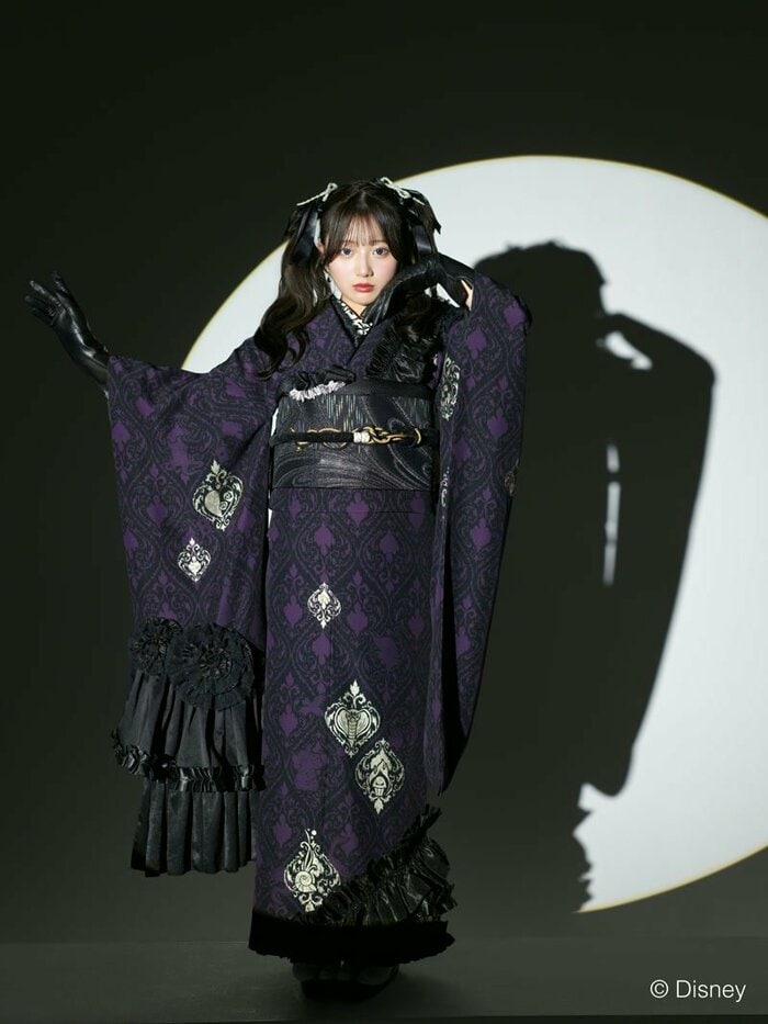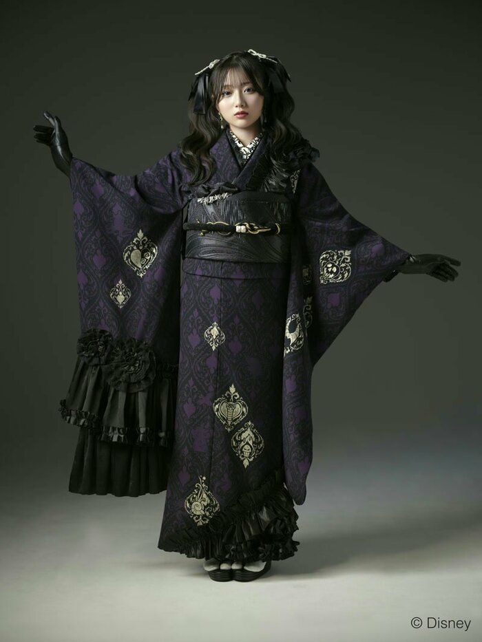 ディズニーヴィランズをインスパイアしたという、クールで個性的な振袖。「いつもの自分とは違う感じに挑戦してみたい」と、高い位置でのツインテールにも初挑戦!