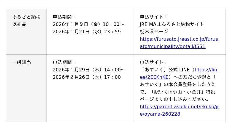 一時保育検索・予約サービス「あすいく」を運営する株式会社あすいく(本社:東京都港区、代表取締役:幸脇 啓子)は、体験型一時保育プログラム「駅いく」において、JR 東日本スタートアップ株式会社(代表取締役社長:柴田裕)、東日本旅客鉄道株式会社大宮支社(執行役員大宮支社長:石井剛史)と連携し、栃木県で初の『駅いく in 小山・小金井』を2026年2月28日(土)に開催します。また、本企画は一般販売に加え、「JRE MALLふるさと納税」において、栃木県の返礼品として新たに提供されます。