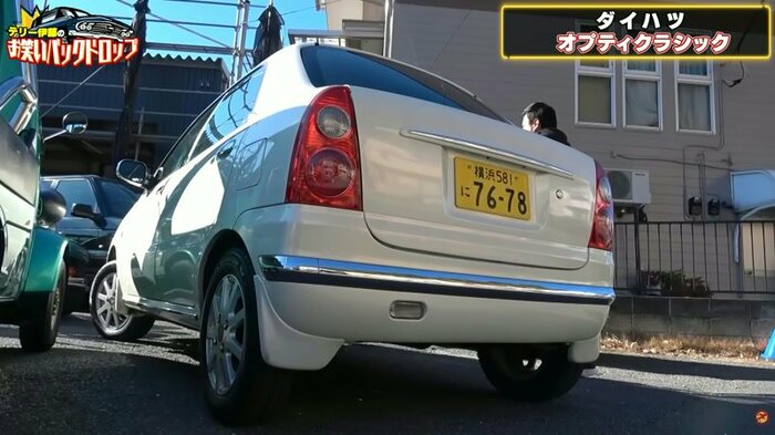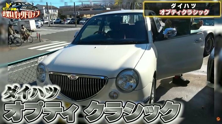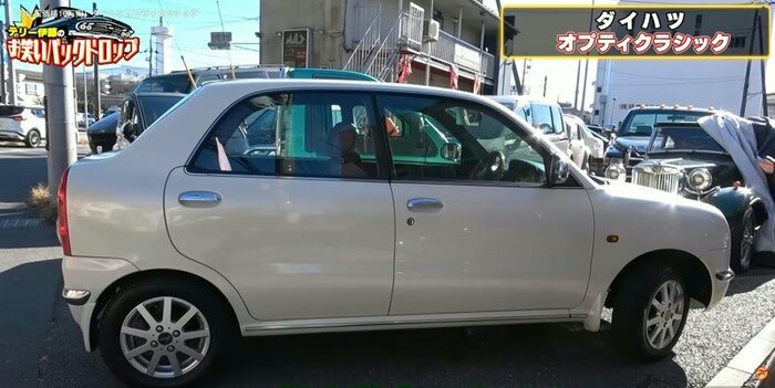 それは平成13年(2001年)式の軽自動車、ダイハツ『オプティ クラシック』。パールホワイトに塗装されたボディにメッキのミラーが映えてクラシカルな印象を演出しています。