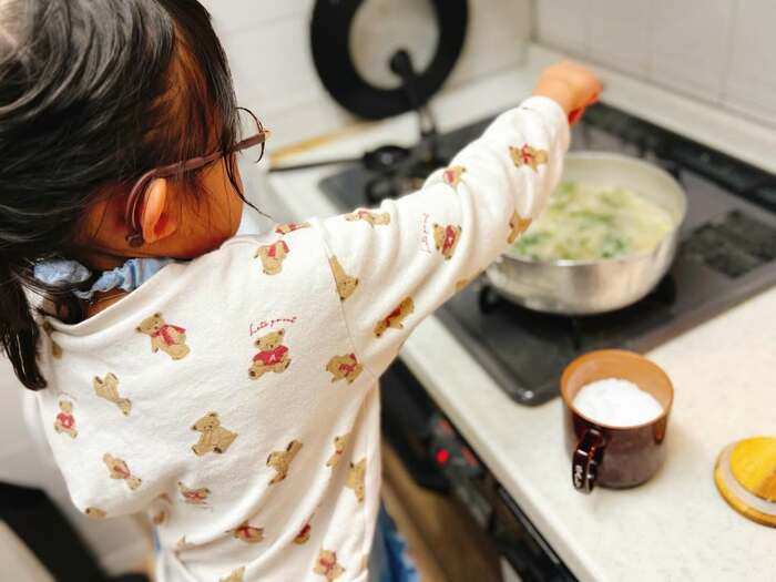 そして、キッチンに立ち、小さな手で鍋に入った七草がゆをまぜまぜする様子も。真剣に鍋を見つめる姿は、まるで小さな料理人です!