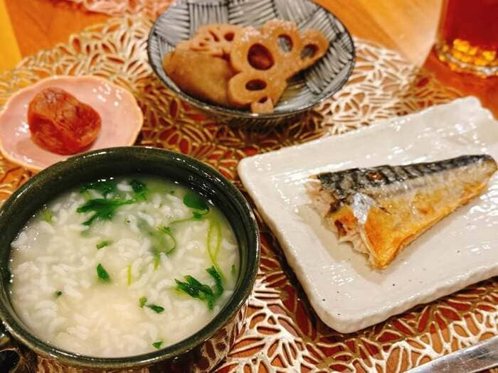 完成した七草がゆは青菜の緑が美しく映え、優しい味わいが想像できますね。焼き魚やれんこんの煮物、梅干しなど、滋味深い副菜が添えられ、お正月明けの体をいたわる献立であることが一目で伝わり、丁寧に整えられた食卓からは、家族を思う気持ちや日々の暮らしを大切にする姿が感じられます。