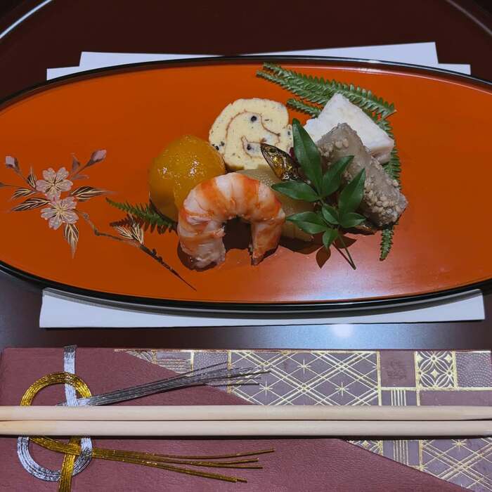 高級感のある花模様が美しい赤×黒の平皿には、えび、ごぼう、卵焼き、きんかんなどお正月らしい食材が丁寧に盛り付けられています。