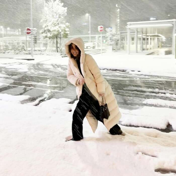 そして最後は、吹雪の中、フードまですっぽりとかぶった白いロングダウンコートに身を包んだ全身ショットも公開した中村さん。