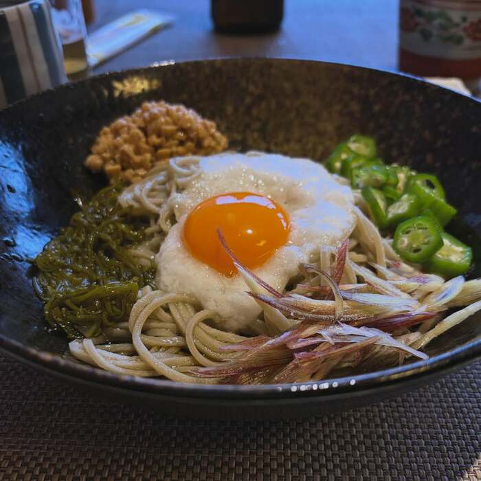 さらに、おくら、納豆、みょうが、海藻などを添えたヘルシーなそばも披露。