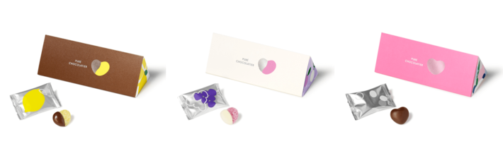 「ピュレショコラティエ」は、甘ずっぱくてジューシーな「ピュレグミ」をこだわりのチョコレートでコーティングしたヒトツブカンロのオープン当時から販売している大人気シリーズです。これまでのギフトにぴったりなおしゃれなイメージを踏襲しつつ、よりスタイリッシュな三角柱型のパッケージにリニューアルします。自分へのご褒美にはもちろん、これからのギフトシーズンでの大切な人へのプレゼントにもぴったりな商品になっていますのでこの機会にぜひお試しください。