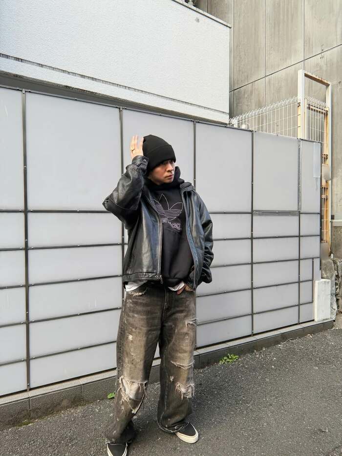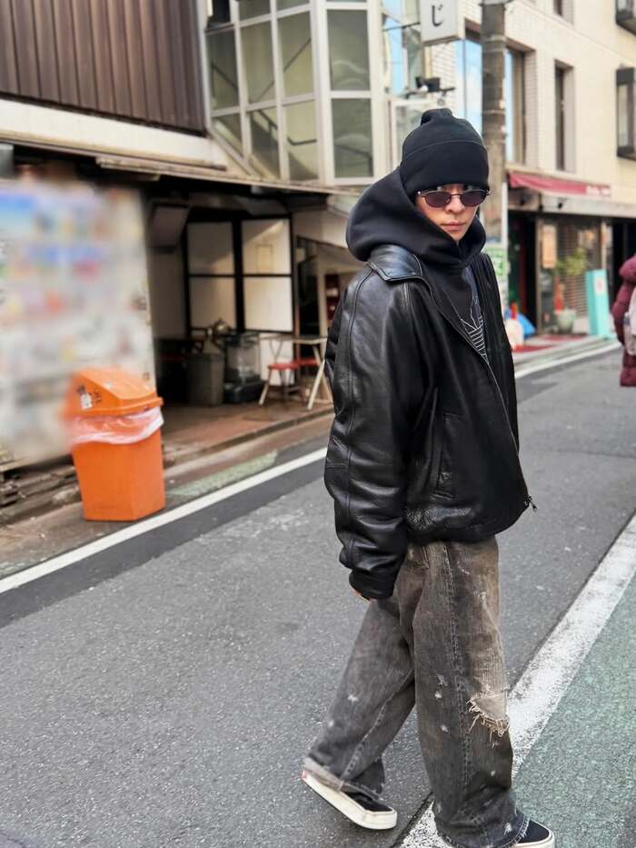写真を見てみると、ニット帽を深くかぶり、黒のフーディー、レザージャケットに、ダメージ加工デニムを合わせたストリートスタイルで、壁の前でクールにポーズを決める姿が。