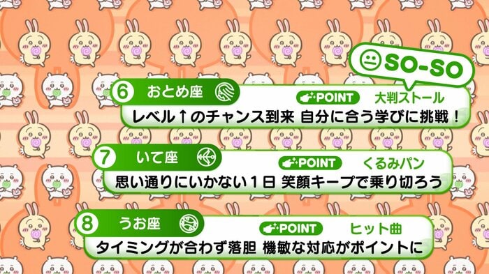 『めざましテレビ』で放送中の「ちいかわ占い」 テレビ放送がない日はお休みで、月~土:朝7時以降に更新予定です。