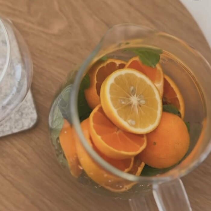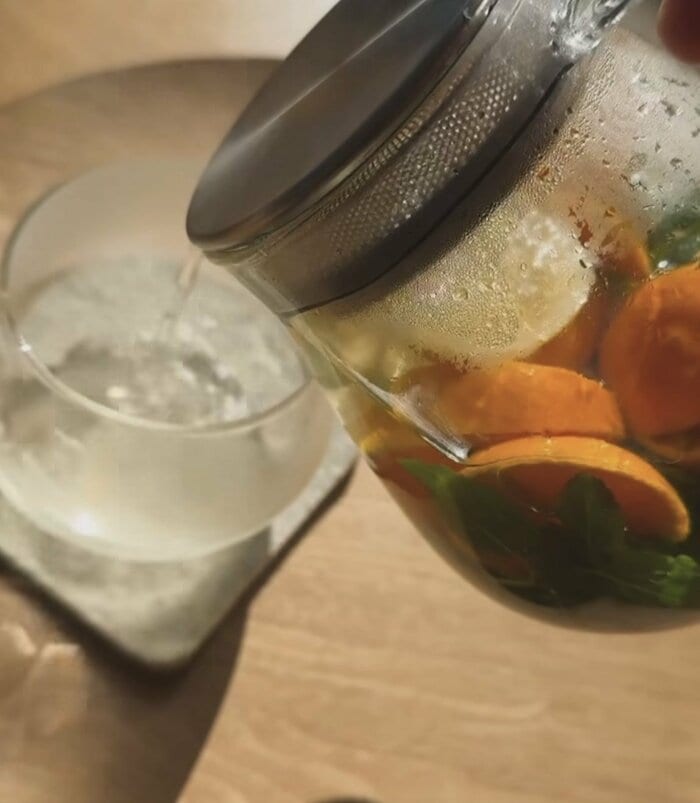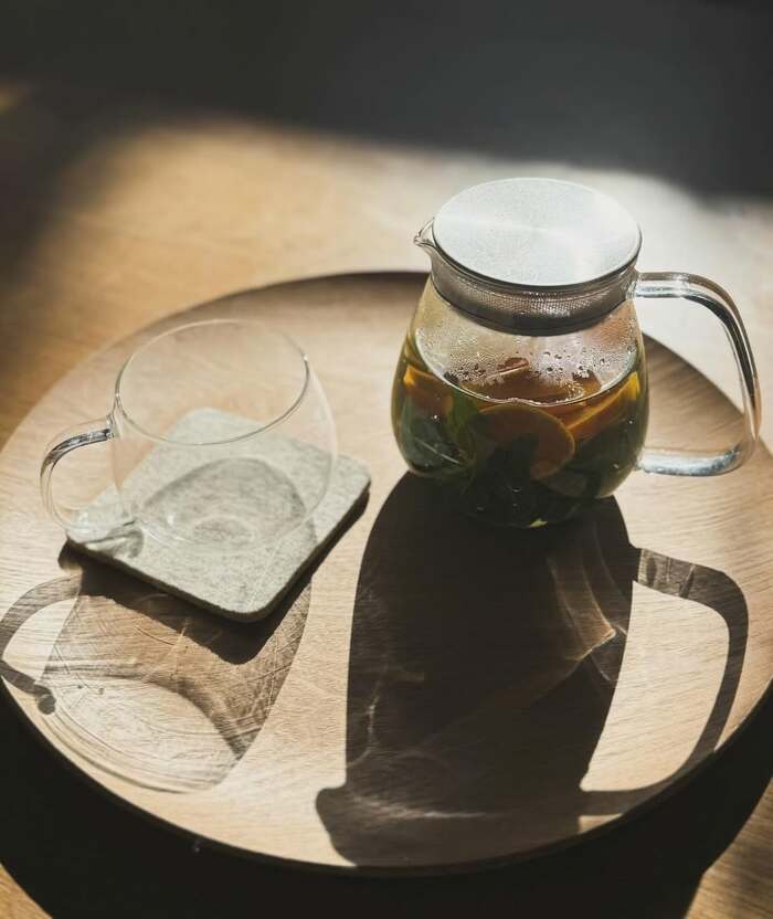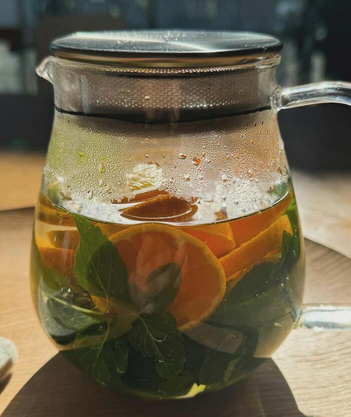 ポットの底にミントを敷き、その上に輪切りのレモンやミカンを重ねて、お湯を注ぐと…