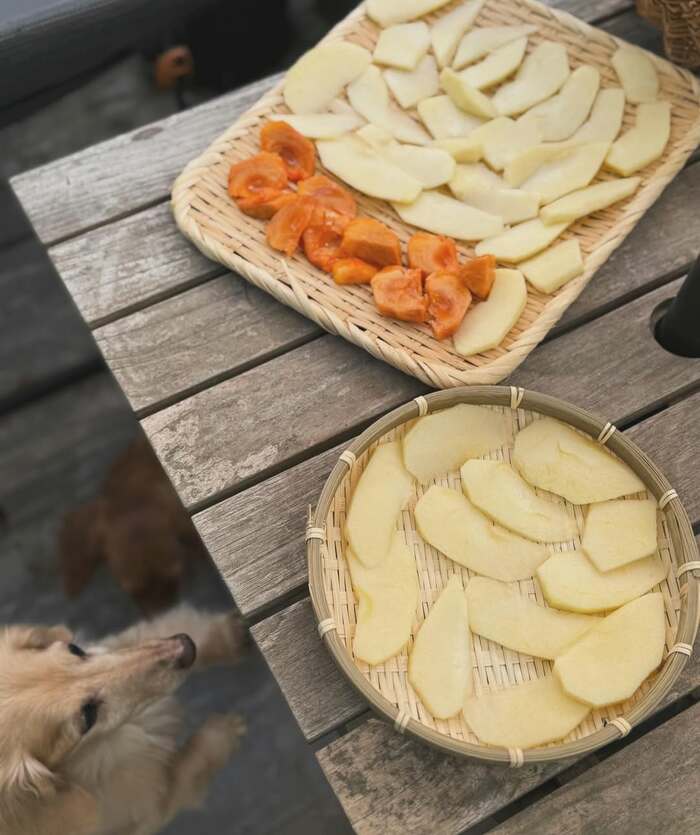 愛犬たちに、リンゴや柿を乾燥させた手作りおやつを準備する写真も。「早く食べたいよ~」と言わんばかりに、テーブルをのぞき込む愛犬の姿が微笑ましい一枚ですね。