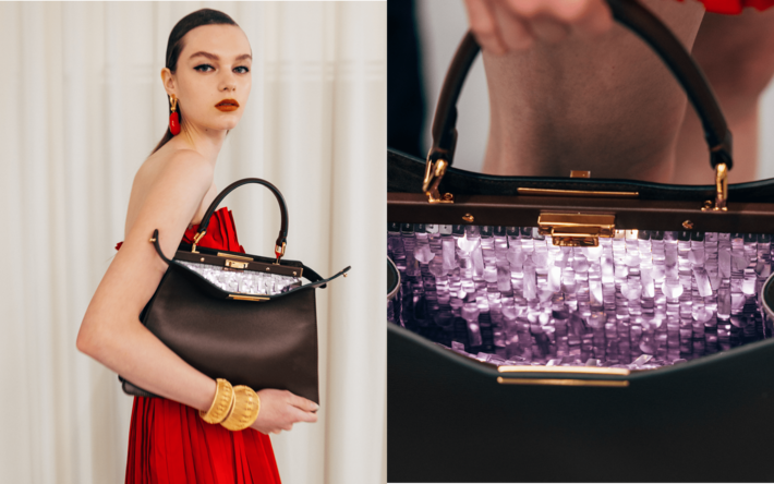 マホガニーブラウンの内側には輝くパープルが、またアシンメトリーなターコイズや細長いグリーンのスパンコールも登場します。コレクションのムードを想起させる、まるで太陽に照らされているようなイエローのバッグは、立体的なモザイクを再解釈したマルチカラーのフラワースタッズがインナーを彩り、クリスタルのフラワーモチーフは、マホガニーブラウンのバッグの中に予期せぬ宝石のような効果を生み出します。フェンディの“マスター・オブ・マテリアル”の崇高な表現として、ピンクのミンクで作られたハイエンドな「ピーカブー」は200時間以上の手作業を要する抽象的なフローラルモチーフを再現し、色彩豊かに飾られています。