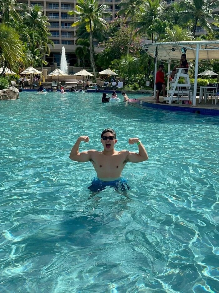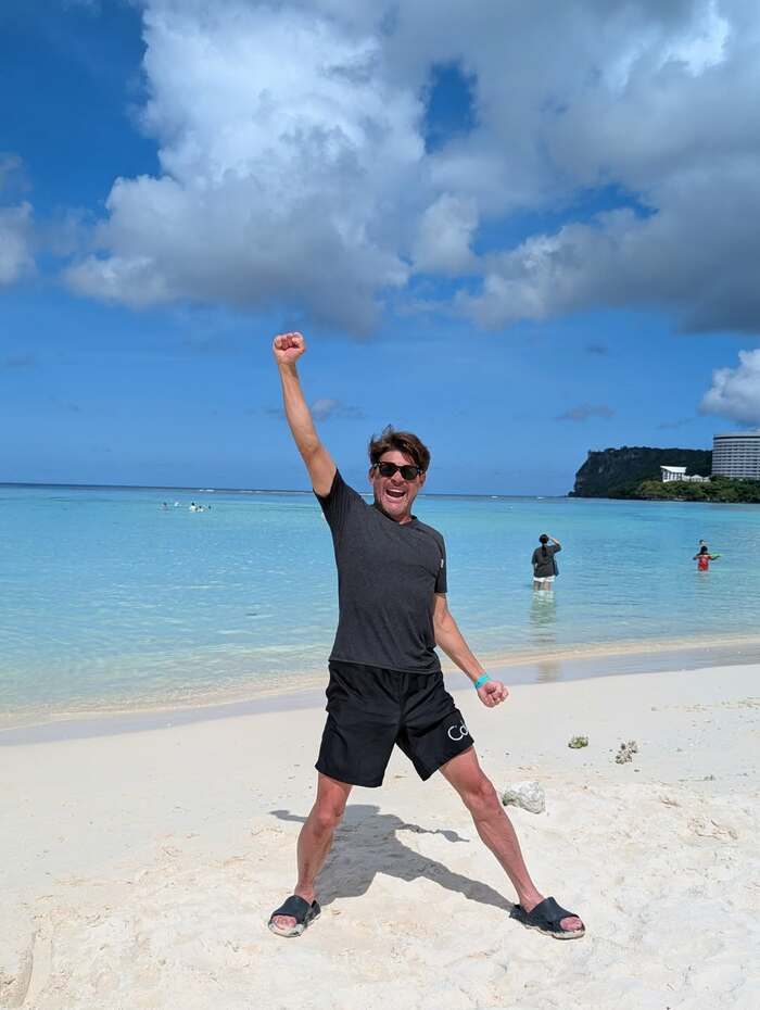 青い海と青い空を背に、大きく口を開けて力いっぱいガッツポーズをしたショットで、家族とグアムを訪れていることを報告しました。太ももやふくらはぎにはこんもりと筋肉がつき、Tシャツの生地が前に張り出しているように見えるほど、胸板の厚さが際立っています。