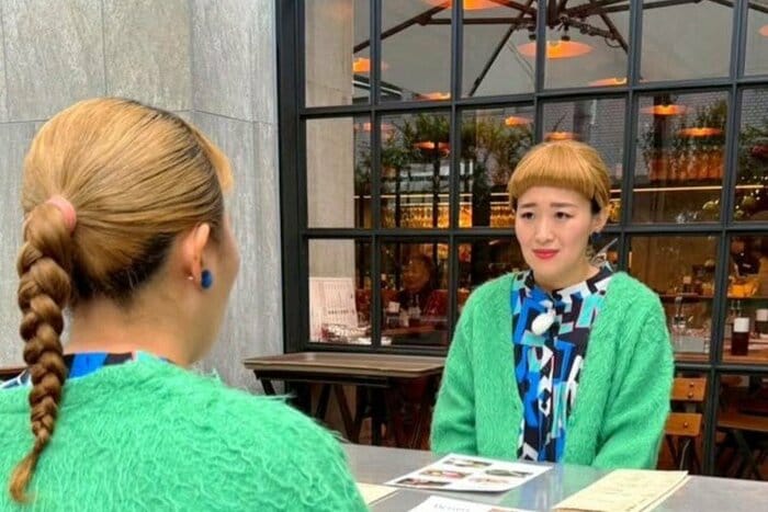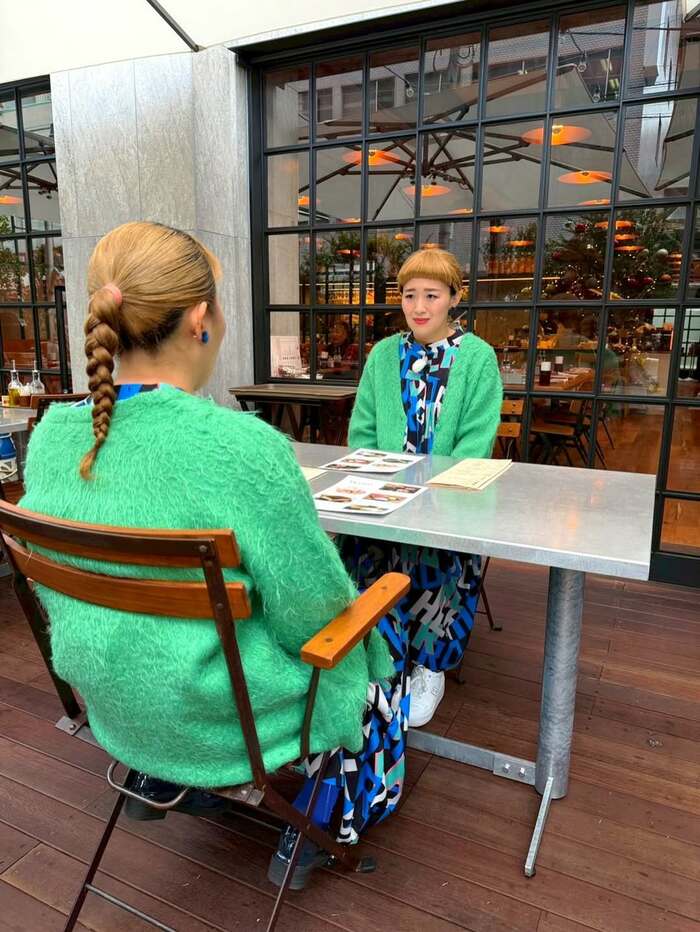 おしゃれなテラスで、テーブルに向かって腰を掛けている丸山さんを後ろから写したショット。丸山さんの目の前に大きな鏡が置かれ、カメラに背中を向けつつも顔がこちら側に見えているのかと思いきや・・・