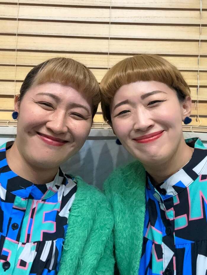 丸山桂里奈さんです!2人は親指と人さし指で丸を作り、額の横につけるポーズをし、お互いの方に少し顔をかしげてカメラを見つめています。オン眉でぱっつんと切りそろえられた前髪やきゅっと口角を上げてほほ笑んだ表情など、沙羅さんは丸山さんのチャームポイントをしっかりととらえています。