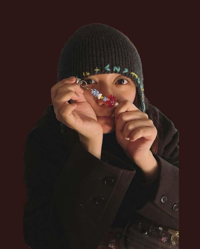 黒いコートにグレーのニット帽をかぶり、顔の前でかわいらしい魚モチーフのキーホルダーを持ち、カメラを見つめています。上白石さんはすっぴんと思われ、透明感ある肌やナチュラルな目元からは、素顔ならではの柔らかさが感じられます。飾らないナチュラルな表情がとても素敵ですね。
