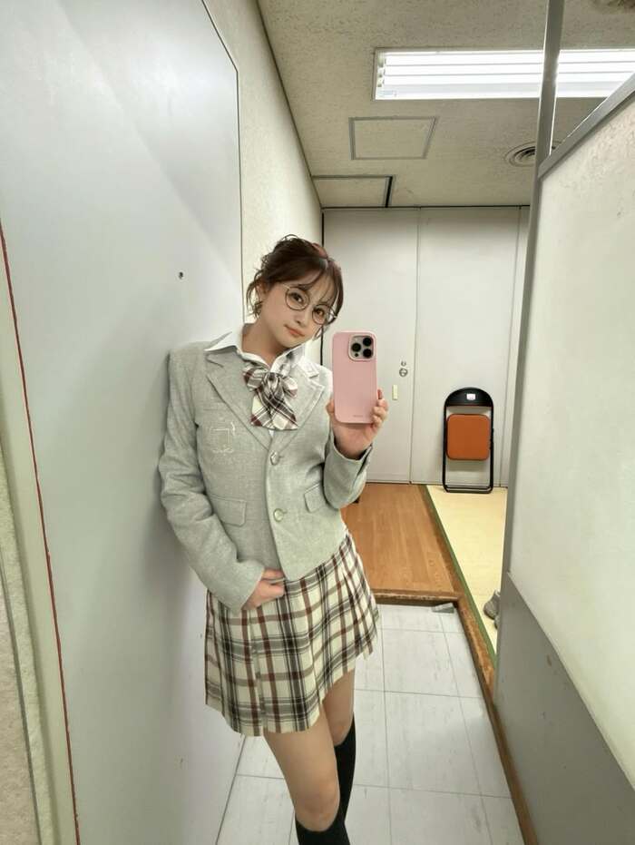ライトグレーのブレザーに茶色と黒のチェック柄スカートとリボン、ハイソックスを合わせたコーディネートに、ふんわりとカールをした髪の毛を一つにまとめ、メガネと大人かわいい雰囲気を演出しています。
