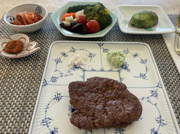 その写真を見てみると、四角いお皿の上にしっかりと焼き目がついた大きなステーキ肉がどーんと乗っていて、塩とわさびでシンプルな味付けに。