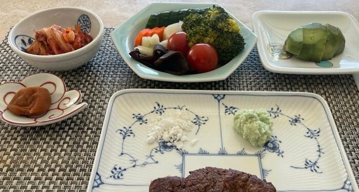 豪快なステーキ肉と栄養バランスばっちりの野菜がならんだ食卓を披露しました。