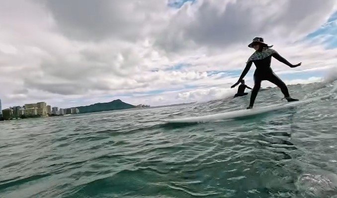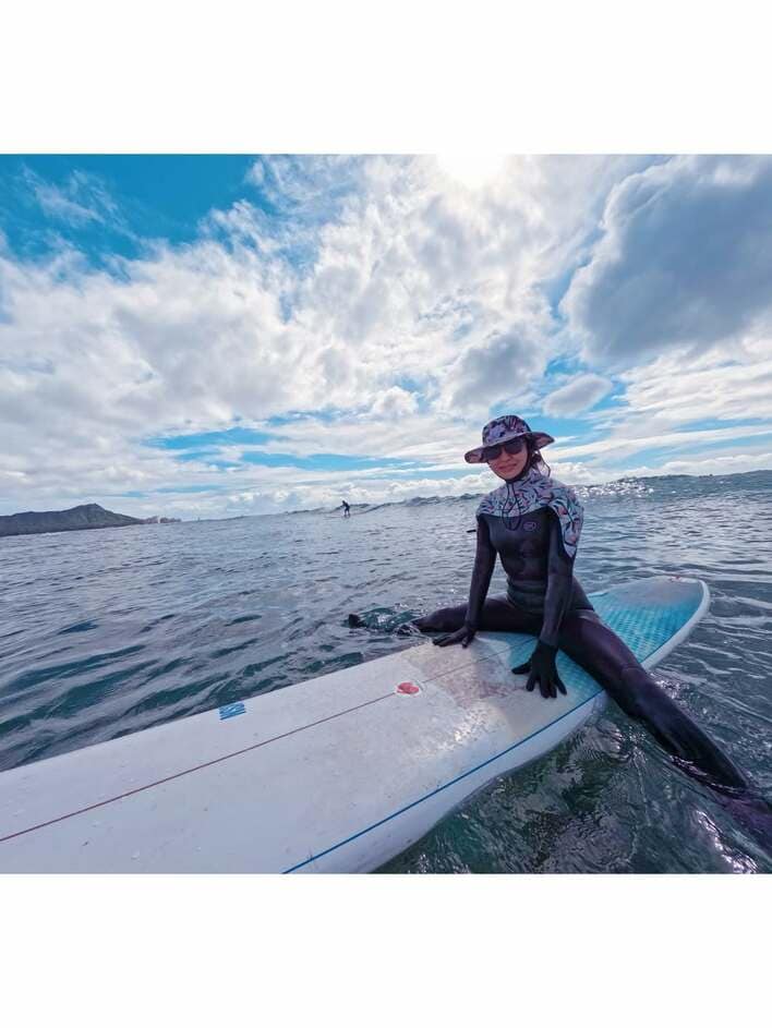 そして今回の投稿では「日本からマイウェットスーツ(数年前に作りました)持参しての1年振りのサーフィン」とつづり、ハワイの海でサーフィンを満喫する姿を公開。