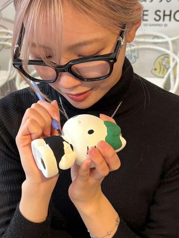 また、今回訪れた施設では、ハローキティの「素焼き絵付け体験」もしたようで、その様子を収めたショットも公開。
