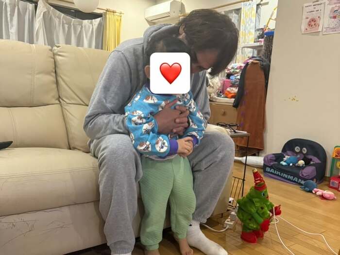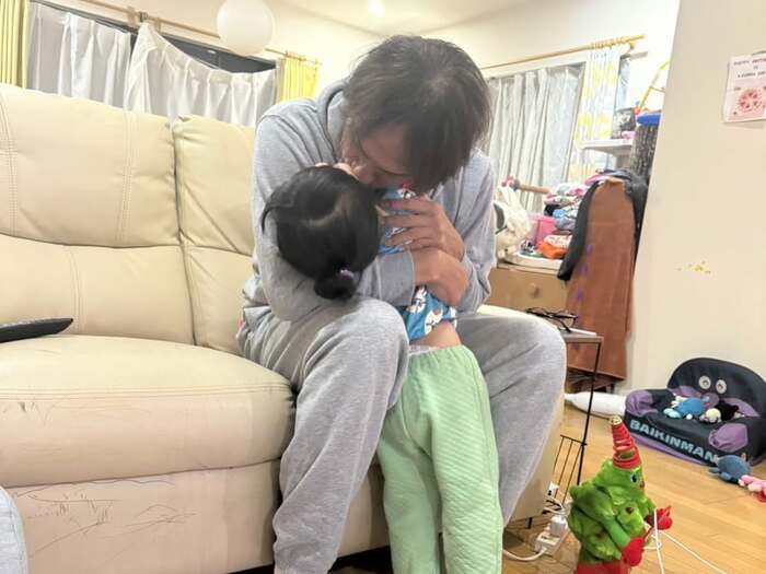 ソファに座りながら小さなぷくぷくちゃんの顔に頬を寄せる本並さん。