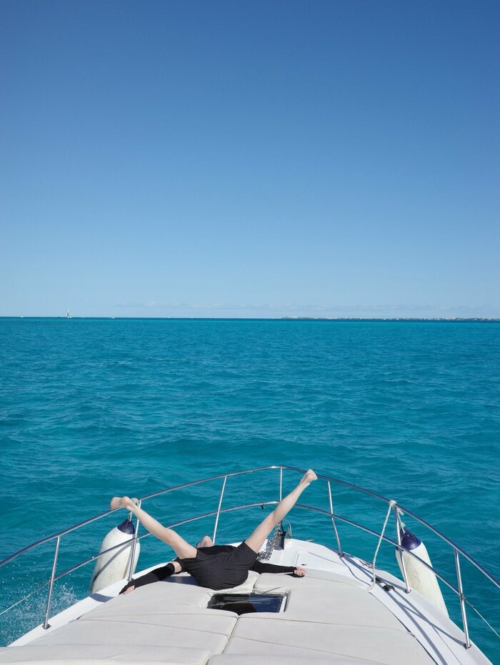 テンションが上がったのでしょうか、船の上にゴロンと寝転んで大開脚を見せたりと、思う存分に非日常を堪能しています。