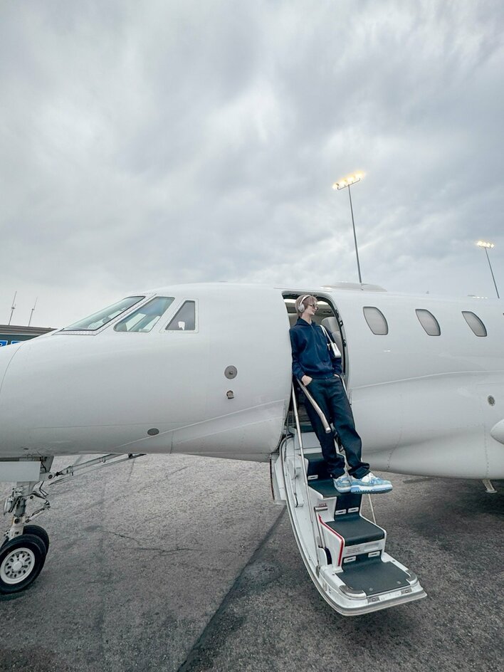 真っ白なプライベートジェットから降り立つショットでは、ネイビー色のパーカーに、黒のズボンを合わせたラフなコーデで登場!ポケットに手を入れてほほ笑む姿から、輝くオーラがあふれています。