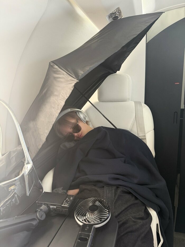 「プライベートジェットの直射日光が暑すぎて溶けそうだった」とつづった写真には、ヘッドホンをつけ、サングラスをかけたMattさんがスヤスヤと眠っています。