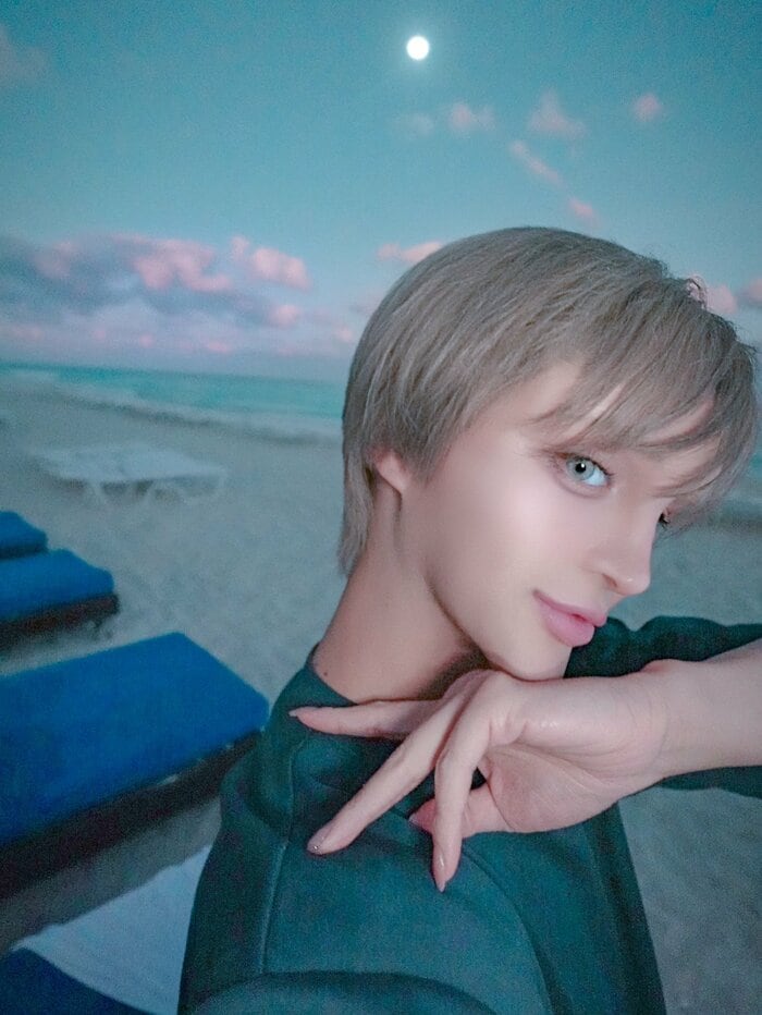 ビーチに訪れた際のショットでは、顎に手を添え、ついつい引き込まれそうな目でカメラを見つめています。