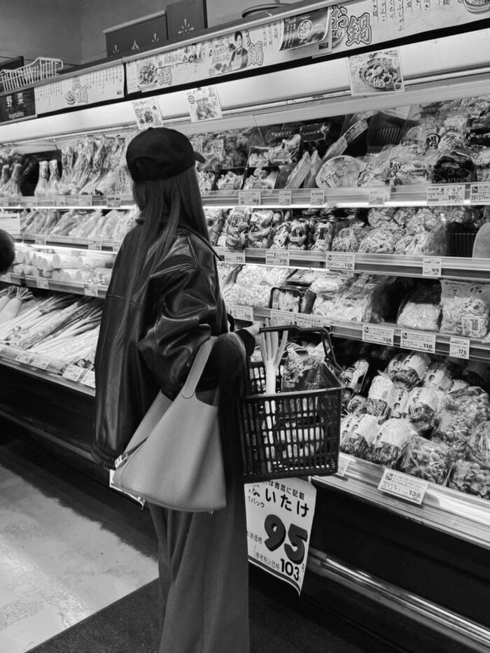 ネギや野菜を入れたカゴを持つ、主婦感あふれる後ろ姿を捉えたモノクロショットも。毎日忙しい日々を送っているにもかかわらず、スーパーで真剣に買い物をする様子に親近感がわきますね。