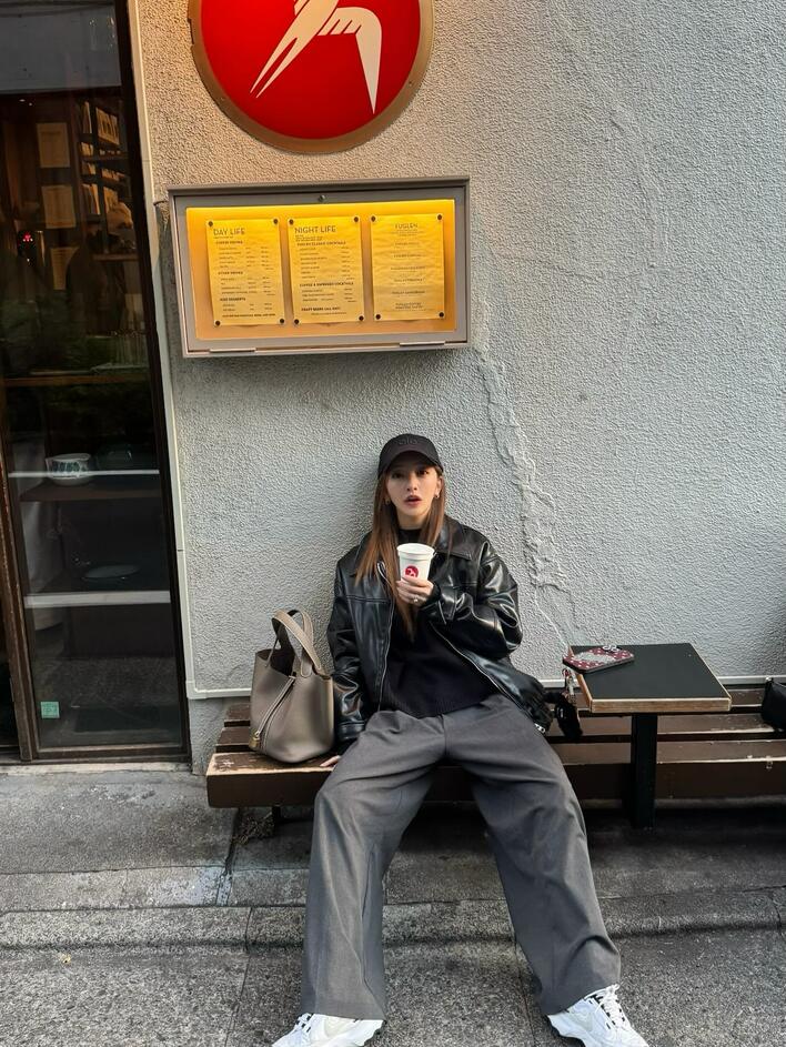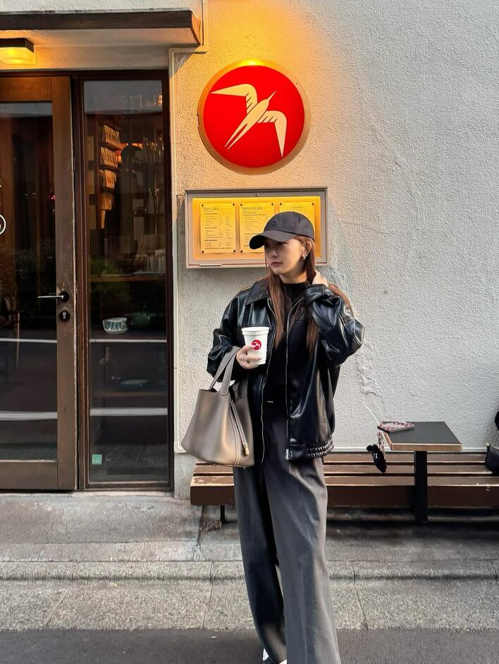この日のコーデは、黒のレザージャケットにネイビーのパンツを合わせたカジュアルスタイルを披露しています。ストレートヘアに黒のキャップをかぶっていますが、輝くオーラがあふれ出ています。
