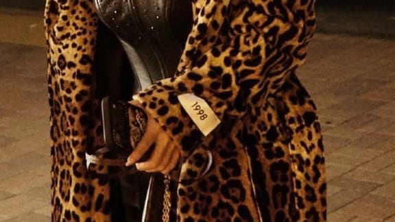 写真には、大きな黒縁メガネに胸元がざっくりと開いたレザー風のインナー、そしてド派手なヒョウ柄のロングコートを身にまとい、颯爽と歩く浜崎さんの姿が。
