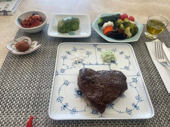 写真には、塩とわさびが添えられた四角いお皿の上に、焼き目がついた大きなステーキ肉がどーんと乗っていました。テーブルの奥には、小鉢に盛られたキムチや梅干し。キュウリやトマト、ブロッコリーなど彩り豊かなサラダに、小皿にはアボカドまで準備されていました。