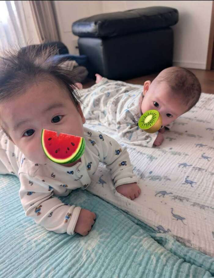 また、双子が首をグッと上げたうつ伏せショットも公開。