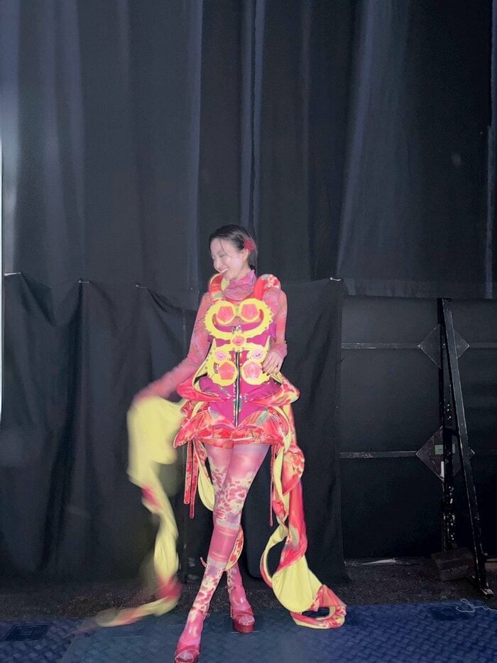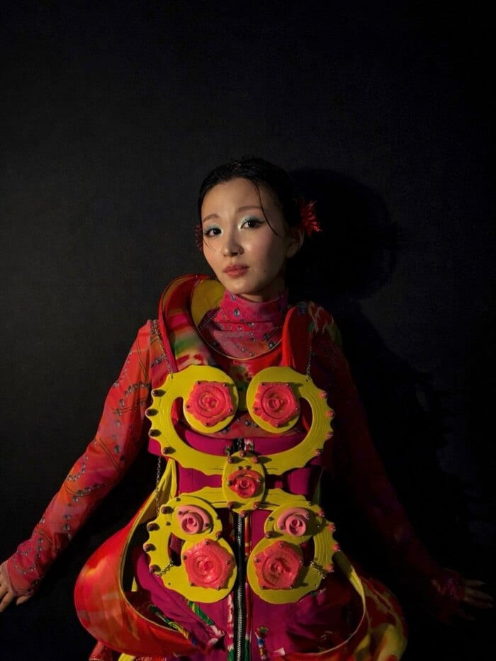 シースルーシャツの上に、大きな奇抜デザインのパーツが付いたセットアップを着用しているようです。ブルーのアイシャドウが塗られた目元もインパクトがありますね。