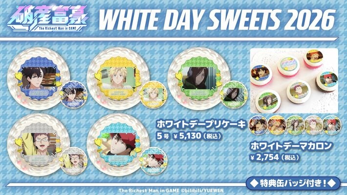 現在予約受付中のホワイトデーケーキとマカロンは、ペイ・チェンや、マー・ヤン(CV.岡本信彦)、ホウ・シュク(CV.小林千晃)、コウ・シハク(CV.土岐隼一)、ルアン・グアンジェン(CV. 仲村宗悟)がプリントされ、ケーキは全5種類、マカロンは全1種類のデザインから選ぶことができます。