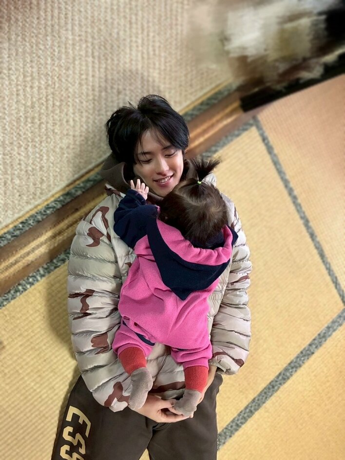 そこには、畳でごろんとあお向けになる河野さんの姿が。胸の上では、小さな赤ちゃんが腹ばいになり河野さんの方に手を伸ばしていて、河野さんはそんな赤ちゃんを見つめて優しくほほ笑んでいます。2人の幸せあふれるショットは、見ているだけで心がほっこりしてきますね♪